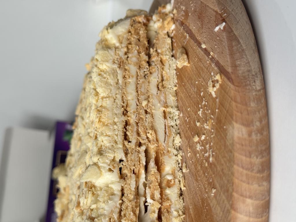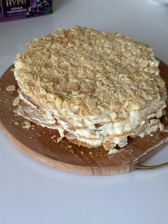 Тесто как песочное. Без яйца очень хрупкое, плоское. Раскатывается с трудом, края рваные, не растягиваются. В готовом виде невозможно снять с противня, крошится. В итоге добавила одно яйцо в тесто. Так хотя бы пузырики появились в коржах. Брала на крем масло 82,5. Для меня показалась слишком густая консистенция. В общем впечатление от рецепта противоречивое. В целом, вкусно. Но Наполеоном бы его не назвала. В этом исполнении дополнила бы прослойку крема орешками.