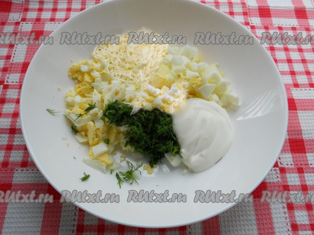 Яйца отварить в течение 10 минут с момента начала кипения воды, а затем остудить их, очистить. Укроп промыть водой, немного обсушить и мелко нарезать. Сыр натереть на мелкой тёрке. Яйца, сыр и укроп выложить на тарелку, добавить пропущенный через пресс чеснок, заправить майонезом, подсолить по вкусу, перемешать.