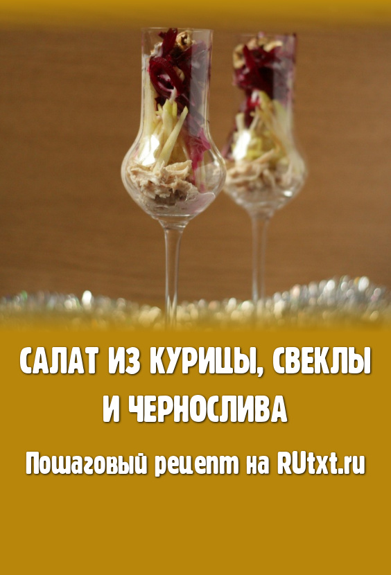 Салат из курицы, свеклы и чернослива можно выложить слоями. А можно просто перемешать все ингредиенты. Я выкладывала слоями: курица, яблоко, свекла.