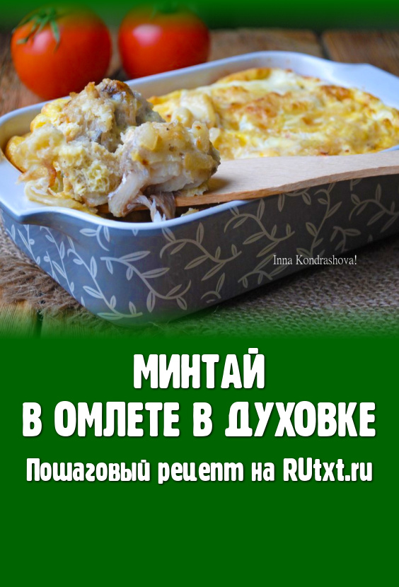 Запекать минтая в омлете 15-20 минут при температуре 180 градусов. Когда омлет запечётся и на поверхности не будет мокрых участков - блюдо готово, можно доставать его из духовки.