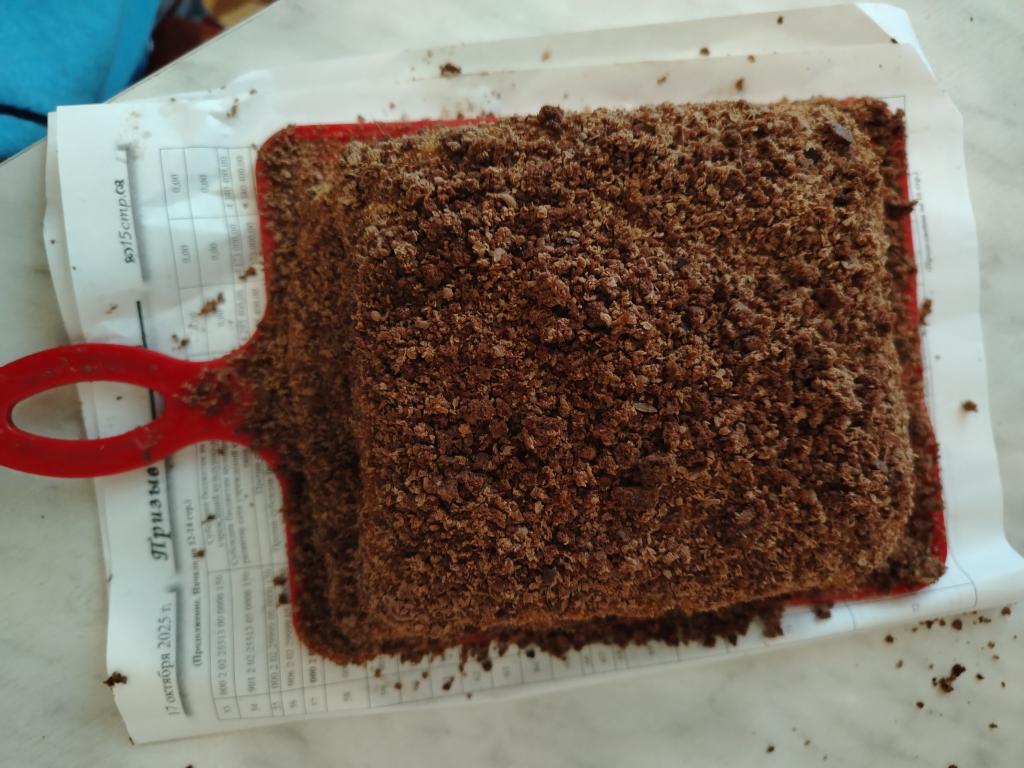Обрезанные края коржей измельчить в чаше блендера до крошки (не слишком мелкой). К крошке добавить натертый на крупной терке черный шоколад, перемешать.