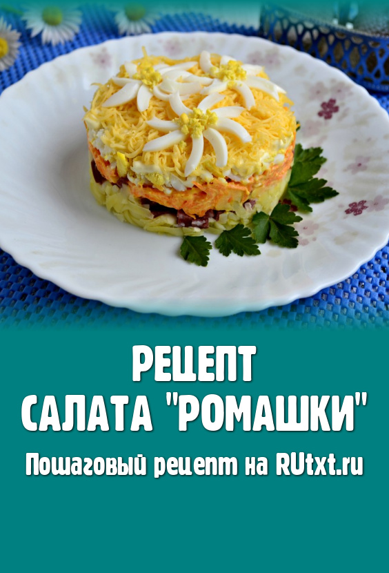 Из белка второго яйца вырезать длинные лепесточки для ромашек (как на фото), разместить их сверху салата в виде цветков, серединку сделать из раскрошенного оставшегося желтка.