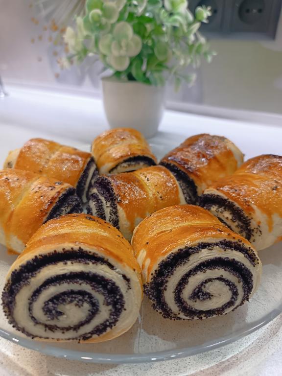 Вкусные, аппетитные булочки достать из духовки, дать немного остыть, переложить на тарелку и можно подавать к столу. Слоёное тесто отлично сочетается с начинкой из мака, поэтому такая выпечка неизменно получается удачной.