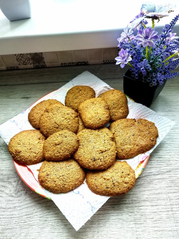 Вкусное, сладкое, достаточно рассыпчатое печенье, приготовленное из овсяных хлопьев без добавления пшеничной муки, подать к столу. Я люблю кушать это печенье, запивая молоком.