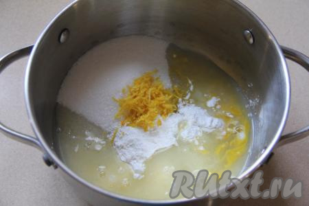 С лимона снять 1 чайную ложку цедры, стараясь не затрагивать белый слой, который расположен под жёлтой цедрой. В кастрюлю выложить сахар, крахмал, яичный желток, цедру.
