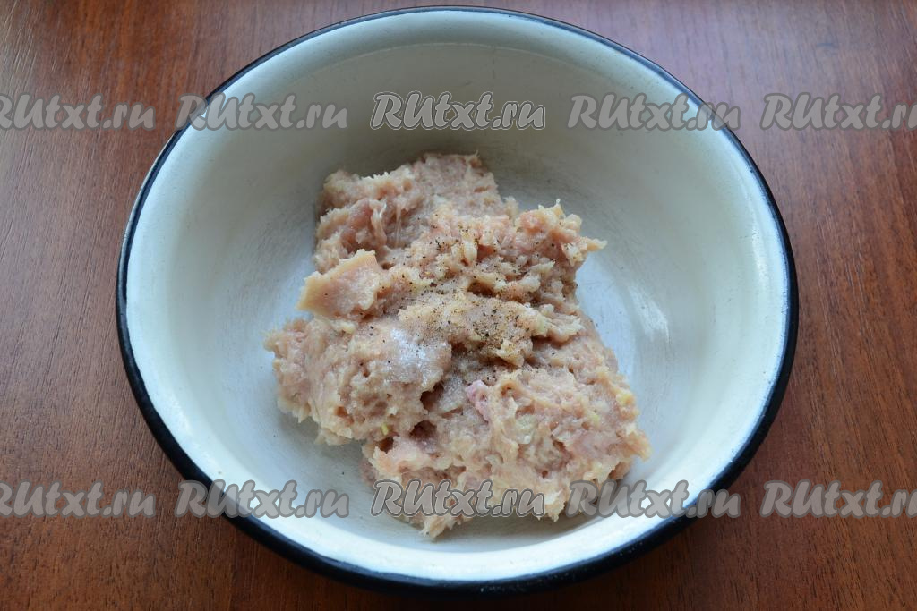 Измельчить мясо с луком до однородного фарша. Выложить фарш в миску, посолить и, по желанию, поперчить.