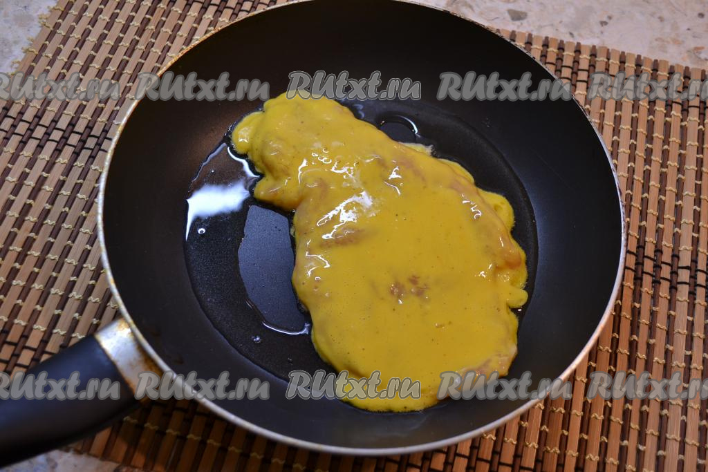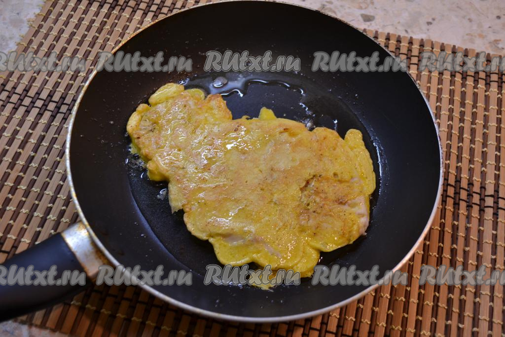 Масло растительное разогреть в сковороде. Отбивную из куриного филе в кляре выложить на сковороду.