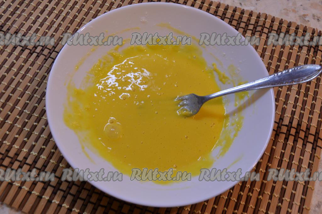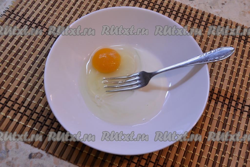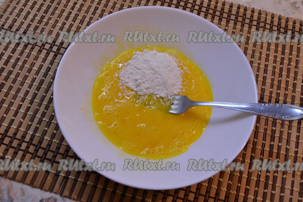 Яйцо тщательно взбить вилкой, затем добавить муку.