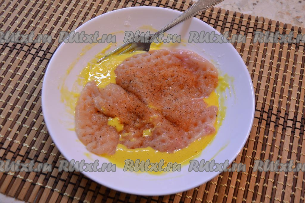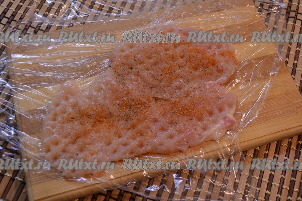 Куриное филе разрезать вдоль на 2 более тонкие части (в результате у нас получится 2 отбивные). Накрыть филе пищевой пленкой и отбить молоточком. Посолить отбивную и посыпать специями.
