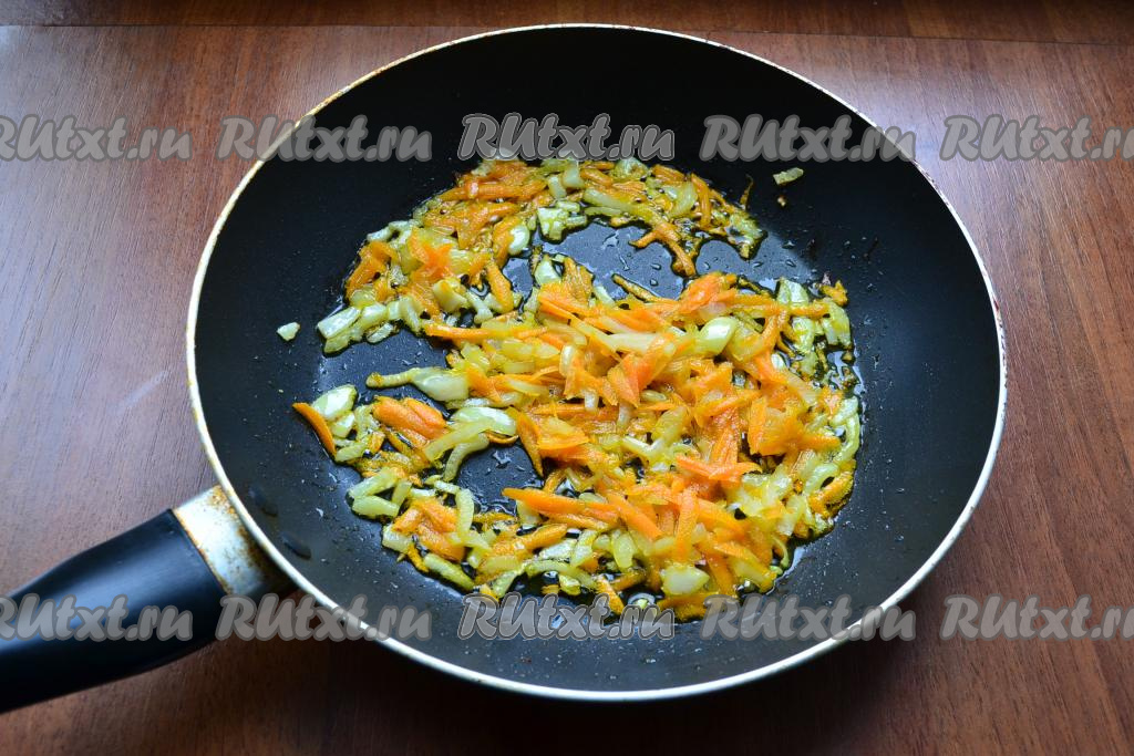 Очищенный репчатый лук нарезать, очищенную морковь натереть на крупной терке, овощи обжарить на растительном масле, помешивая, минуты 3-4 (до мягкости).
