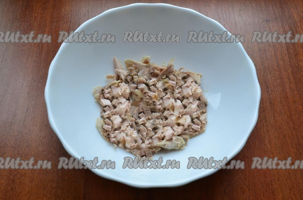 Вареное куриное мясо нарезать или разобрать на волокна.