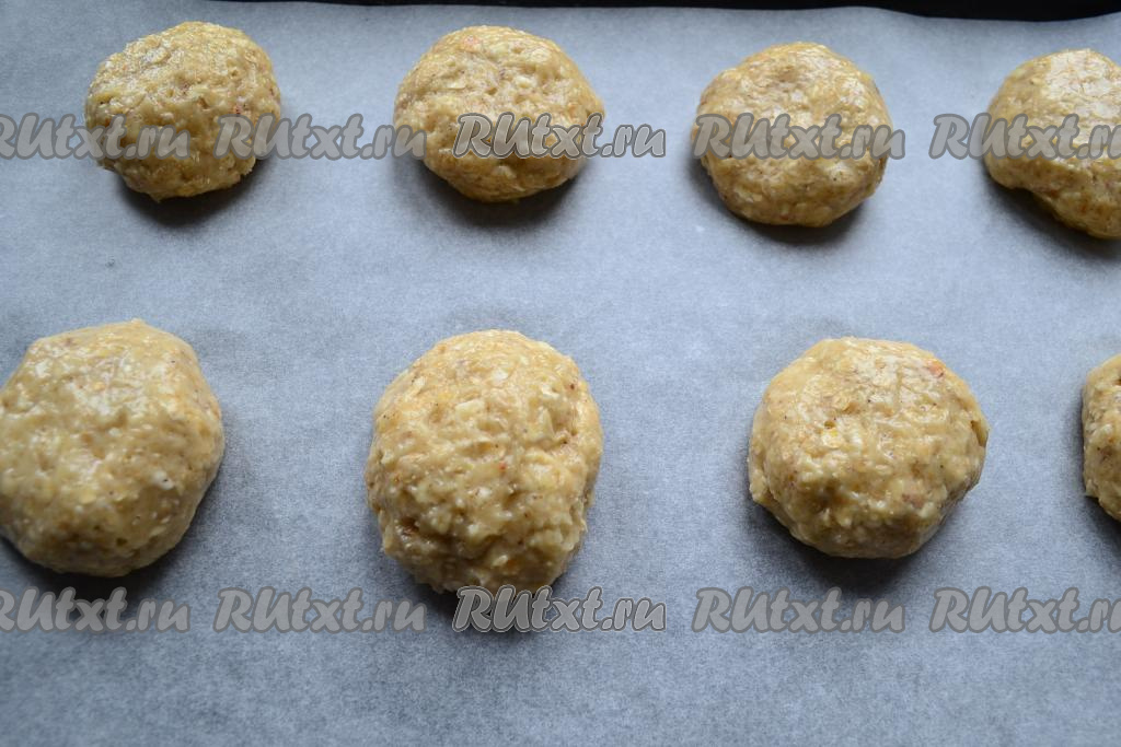 Мокрыми руками из теста сформировать шарики и выложить их на достаточном расстоянии (5-6 см) друг от друга на противне, застеленном пергаментом.