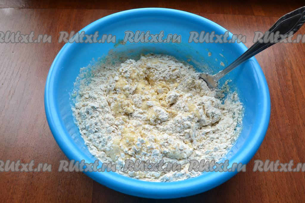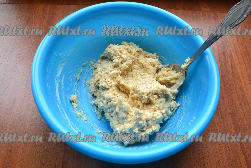 Соединить муку с овсяными хлопьями и разрыхлителем, перемешать сухую смесь.