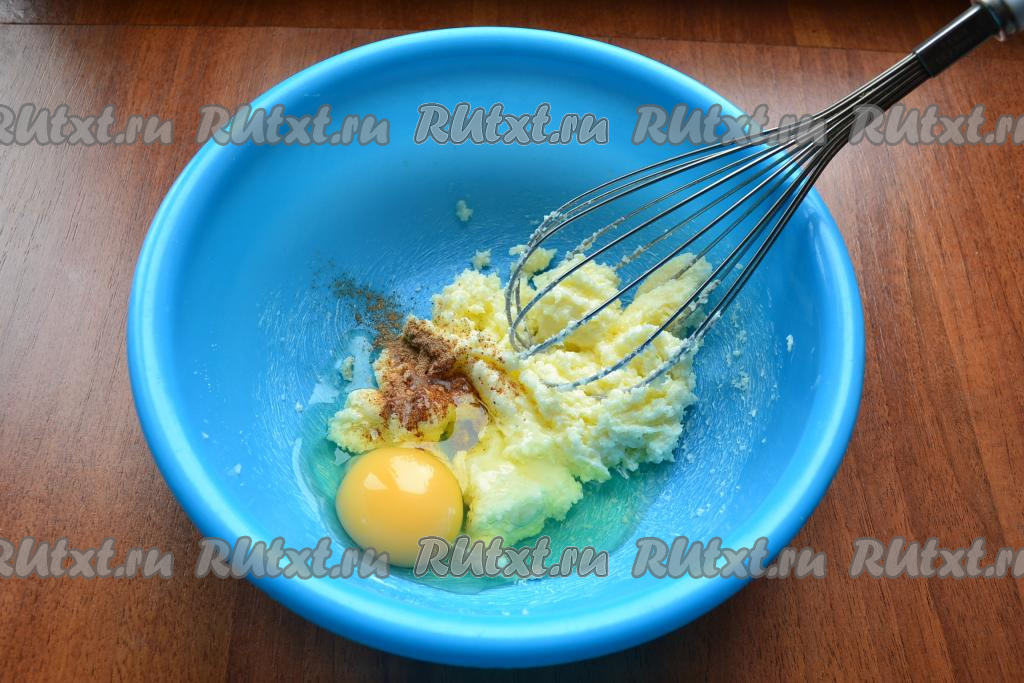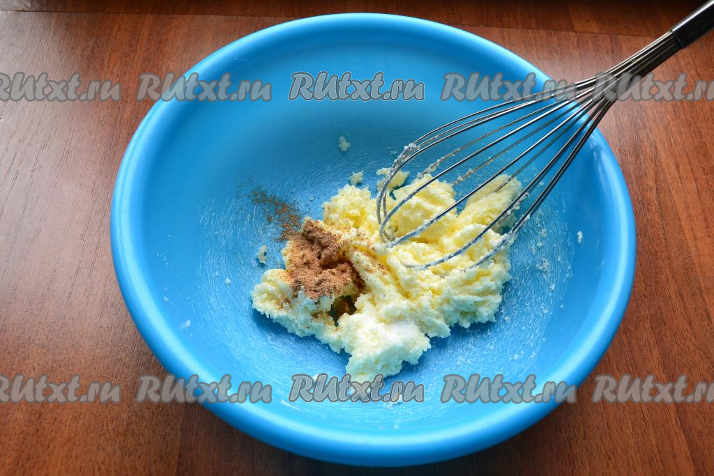 Тщательно венчиком растереть сахар с маслом, добавить щепотку соли и корицу, еще раз растереть.