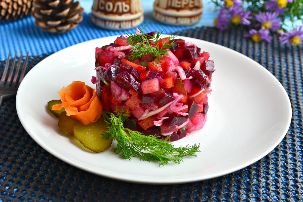 Дать салату немного настояться в прохладном месте (минут 30). Очень вкусный, ароматный овощной винегрет, приготовленный со свежей капустой, подать к столу.