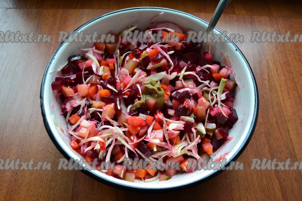 Винегрет посолить, влить подсолнечное масло и перемешать. Далее добавить острую горчицу и еще раз хорошо перемешать.