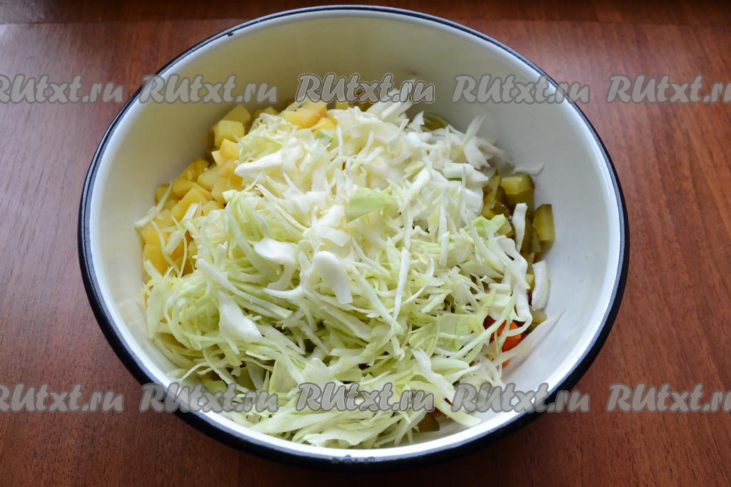 Свежую капусту тоненько нашинковать и тоже добавить в винегрет.