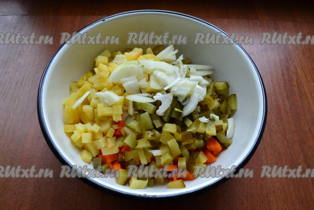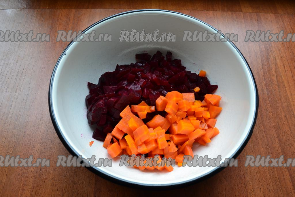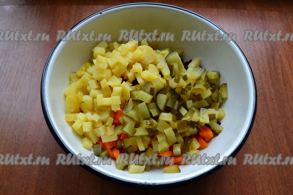 К свекле и моркови добавить очищенный и нарезанный кубиками картофель, нарезанные такими же кубиками маринованные огурцы.