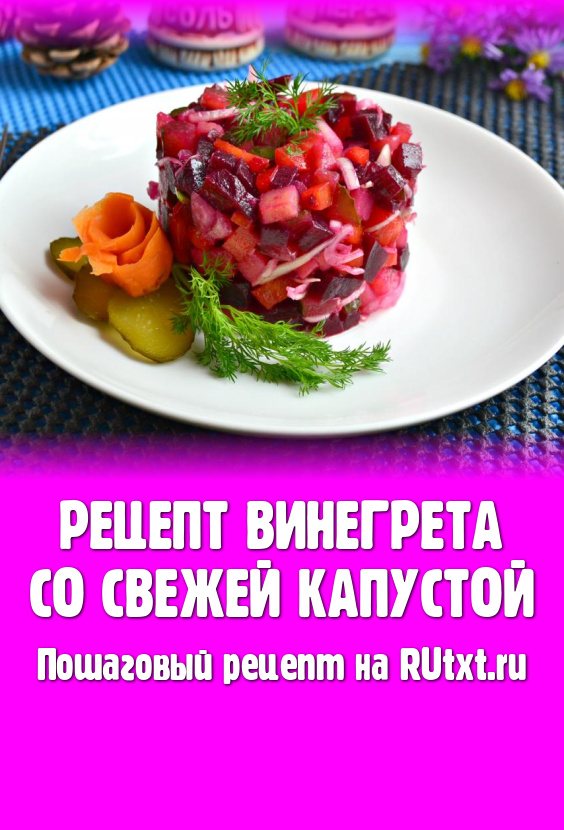 Винегрет - популярный и, наверное, самый любимый салат во многих семьях. Готовится он из простых продуктов и получается очень вкусным. В классическом рецепте этого салата добавляют квашеную капусту, а я предлагаю вам попробовать винегрет со свежей капустой. Дополнить салат вы можете консервированным горошком или фасолью, маринованными грибочками. Заправлять винегрет лучше всего ароматным домашним подсолнечным маслом.