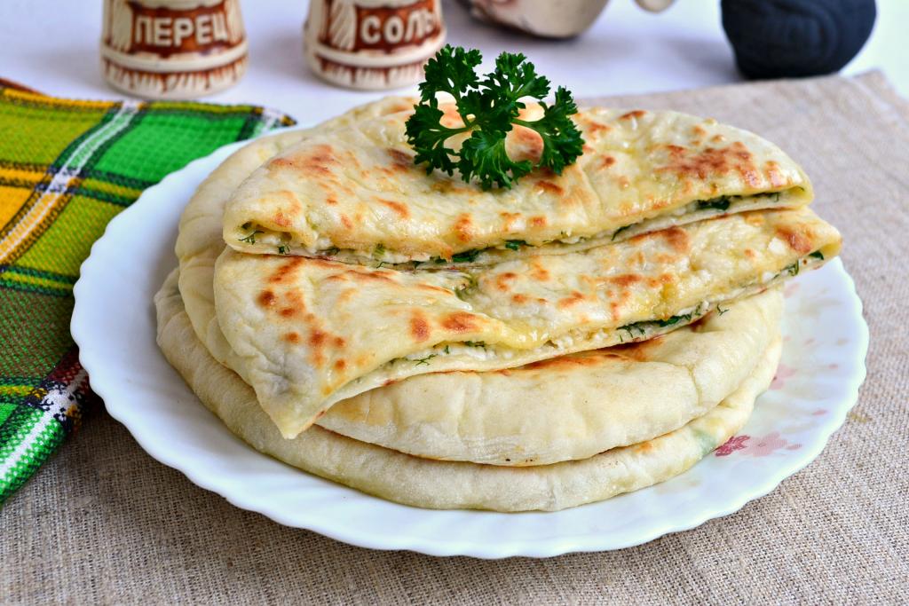 Необычайно вкусные, мягкие лепешки с сыром и зеленью, приготовленные на сковороде, подать к столу горячими. К лепешкам можно предложить сметану или сметанно-чесночный соус.