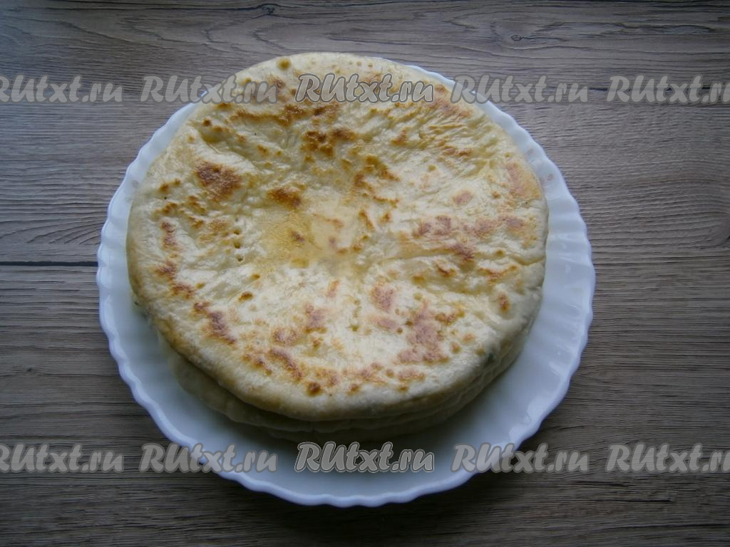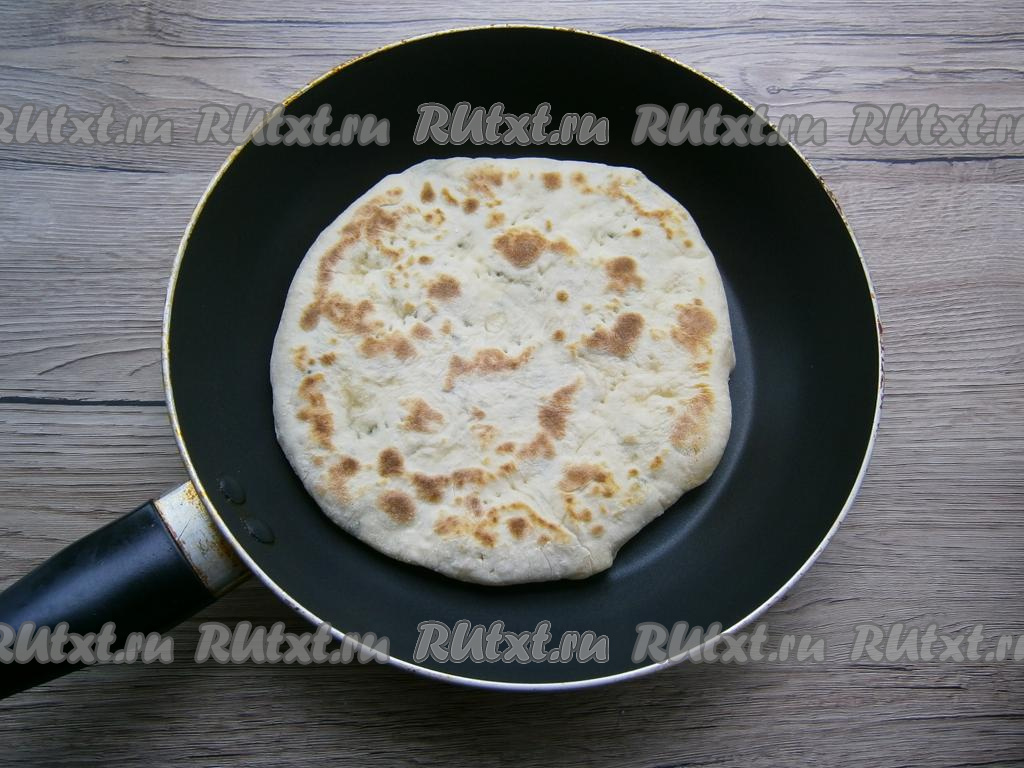 Жарить каждую лепешку с сыром и зеленью на разогретой сухой сковороде на среднем огне до румяности с двух сторон. Лепешки жарятся быстро (по 1,5-2 минуты с каждой стороны).