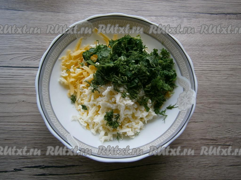 Добавить к сыру измельченную зелень укропа и петрушки.