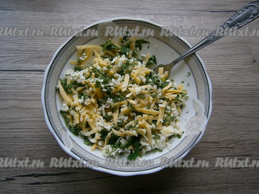 Раскатать каждый шарик из теста в небольшую лепешку, в центр которой выложить часть начинки из сыра и зелени.