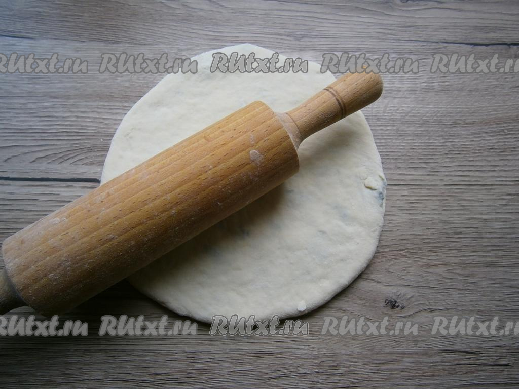 Края лепешки соединить вместе в центре (поднять края лепешки со всех сторон к центру и соединить), затем лепешку аккуратно раскатать скалкой как можно тоньше.