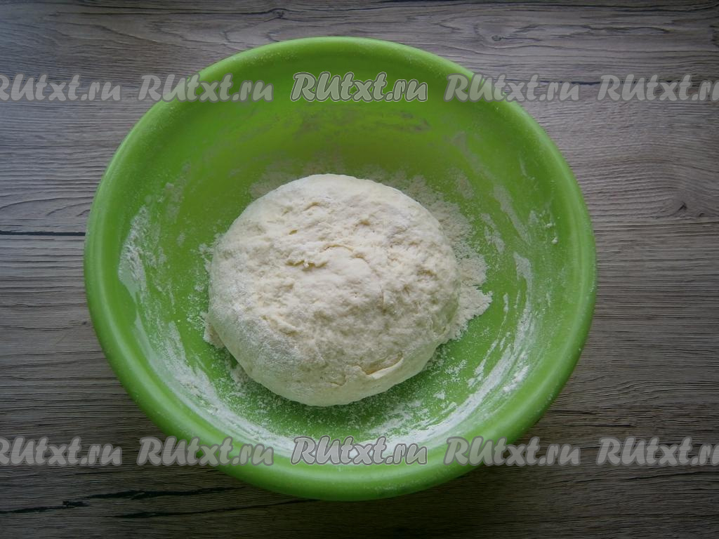 Замесить не крутое, чуть липнущее тесто, собрать его в ком и, накрыв пленкой, оставить при комнатной температуре минут на 30-40.
