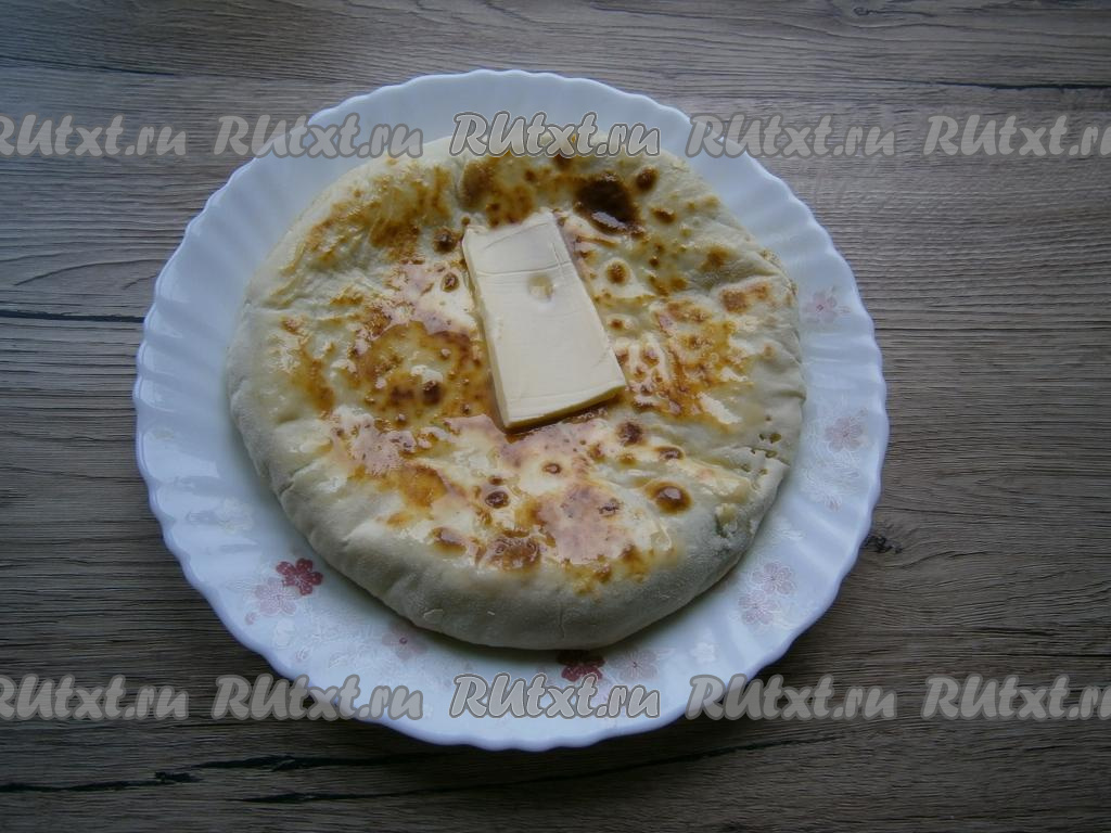 Горячую лепешку сразу же щедро смазать сливочным маслом. Аналогично пожарить остальные лепешки и смазать маслом.