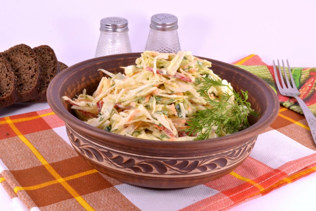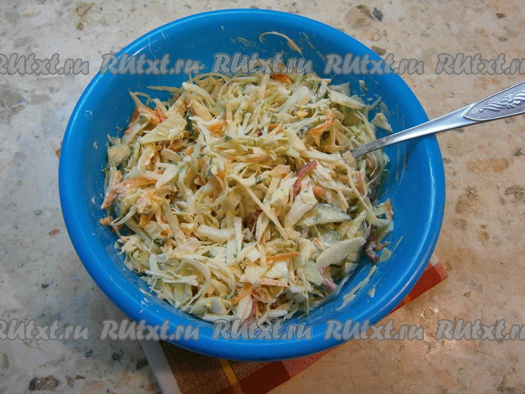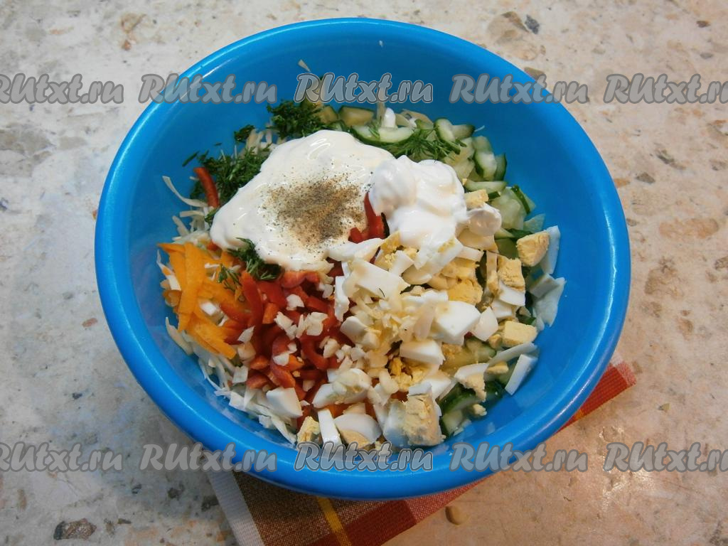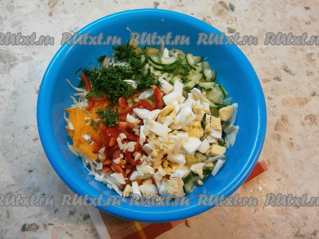 Укроп измельчить, яйца порубить и добавить в салат из капусты, моркови, огурца и перца.