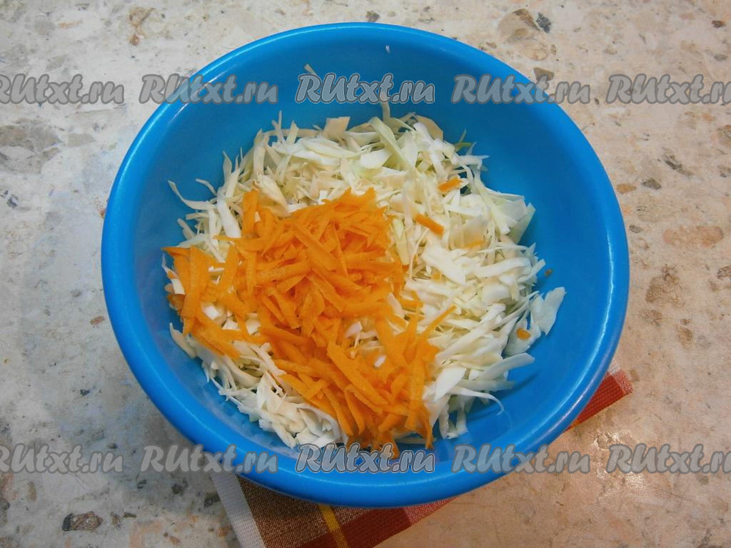 Тоненько нарезать белокочанную капусту, чуть посолить и помять руками. Добавить к капусте натертую на крупной терке очищенную морковь.