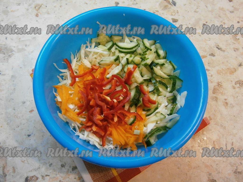 К капусте и морковке добавить нарезанный тонкой соломкой болгарский перец и нарезанный кусочками или соломкой свежий огурец.