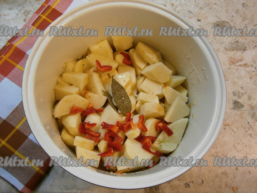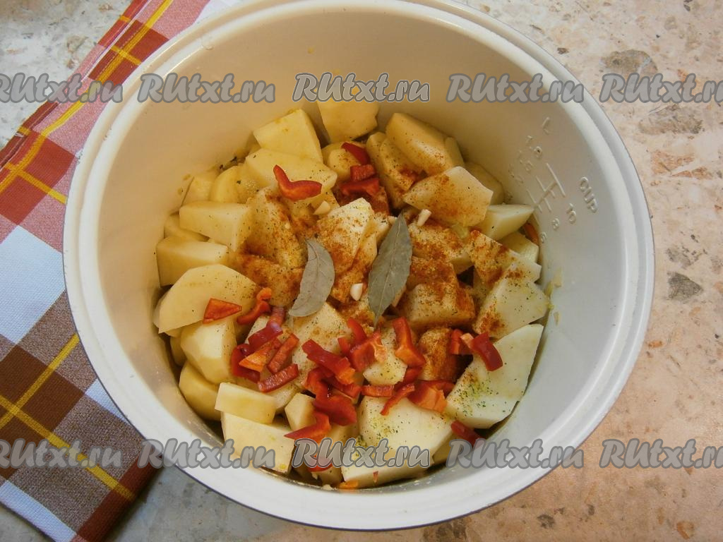 Картофель очистить и нарезать довольно крупно. Болгарский перец, очистив от семян, нарезать на полоски. Добавить картошку и болгарский перец к курице в чашу мультиварки, всыпать соль, паприку, приправу для картофеля, нарезанный чеснок и лавровые листья.