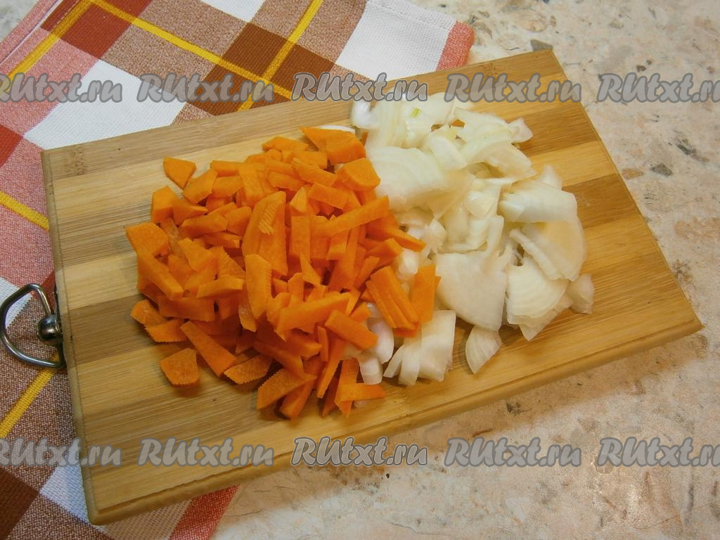 Лук и морковь очистить, нарезать небольшими, но и не совсем маленькими кусочками.