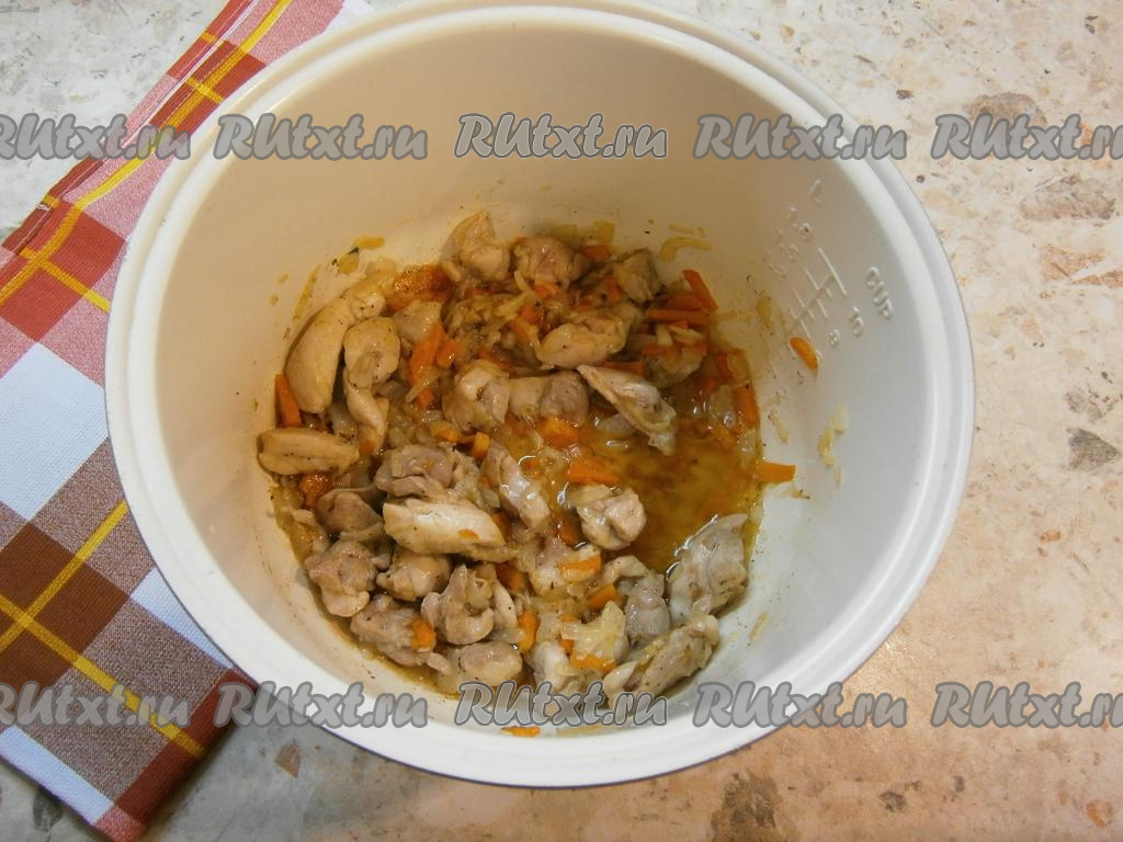 Затем добавить куриное мясо, посыпать специями для курицы и продолжать обжаривание оставшееся время, иногда перемешивая.