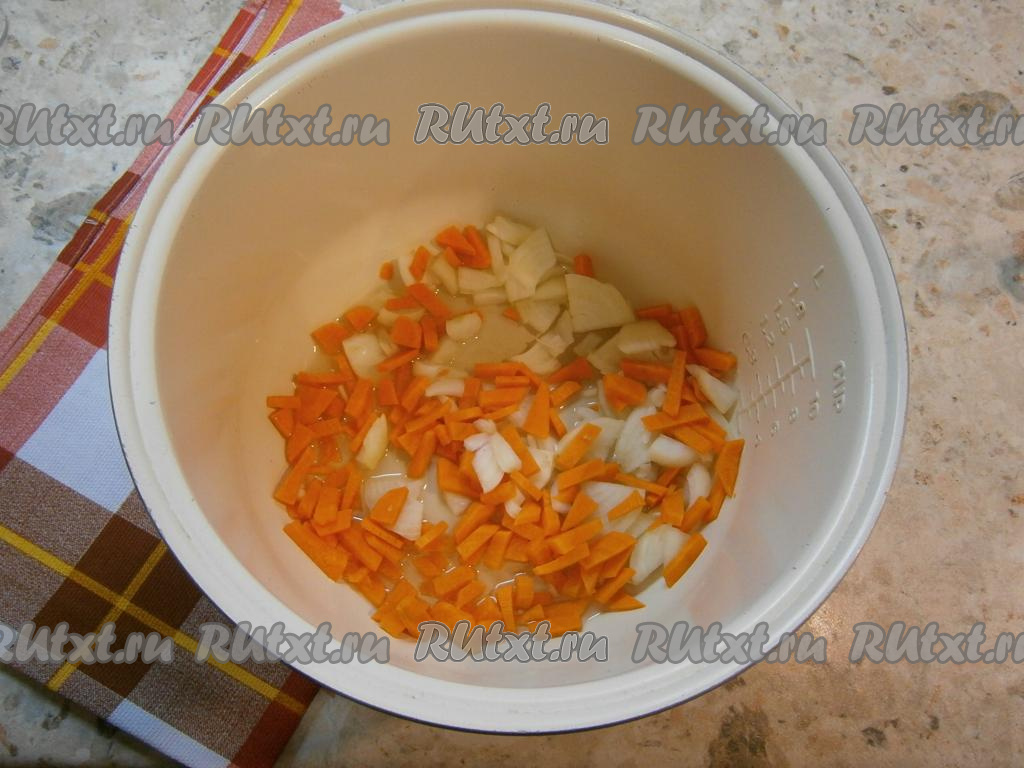 Влить в чашу мультиварки растительное масло, выставить программу "Жарка" или "Выпечка" на 20 минут. Через 5 минут выложить в чашу нарезанные лук с морковкой и обжаривать 5-7 минут, помешивая.