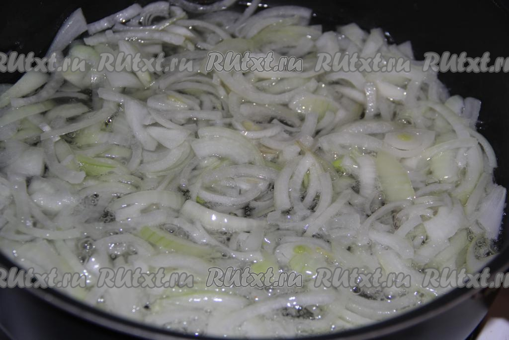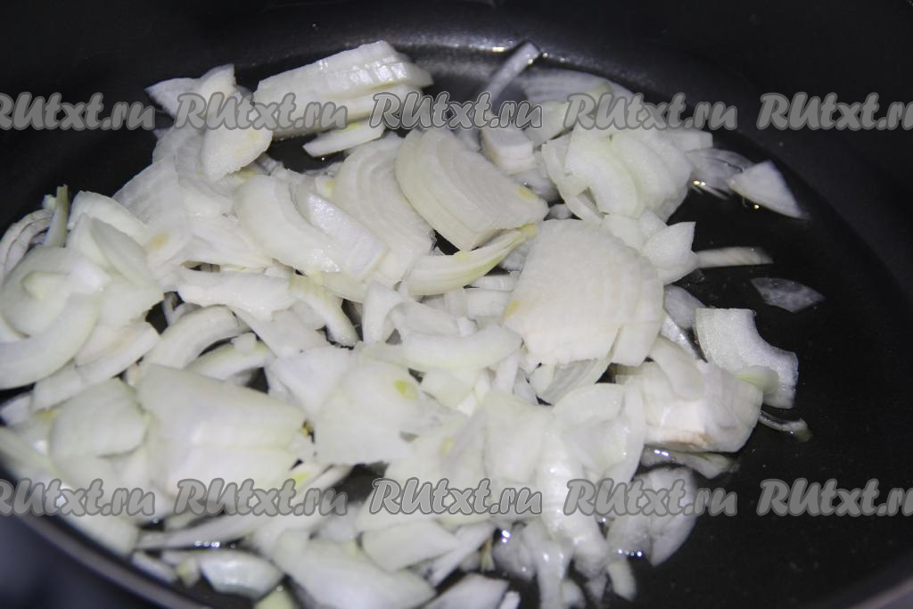 Очищенный лук нарезать тонкими полукольцами. Влить растительное масло в глубокую сковороду, добавить лук и поставить на огонь.