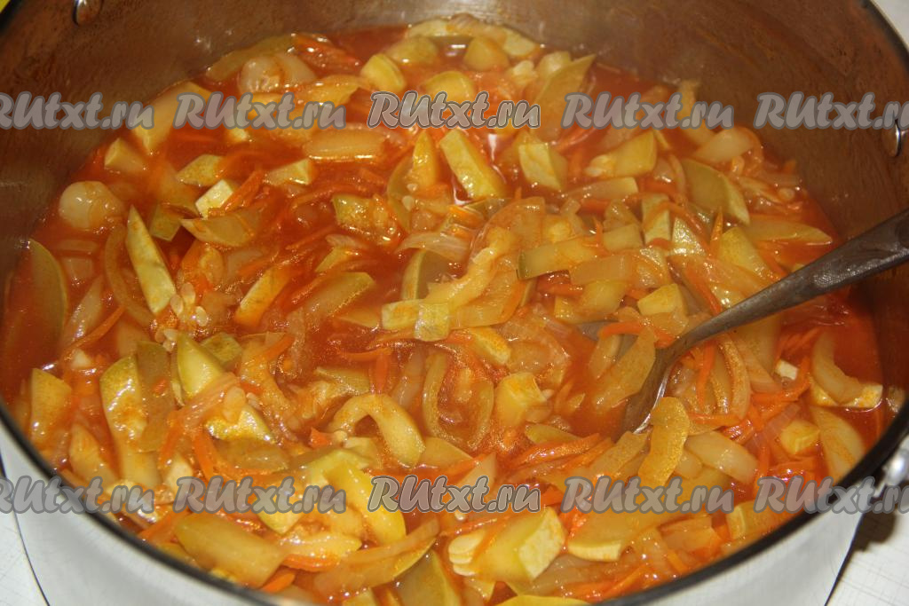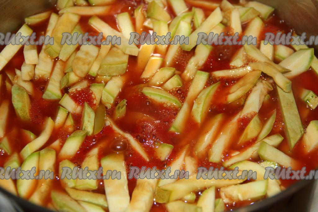 Хорошо перемешать кабачки с томатной массой.