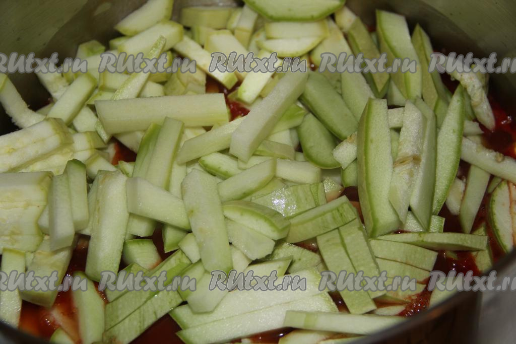Кабачки вымыть (молодые кабачки можно не очищать от кожуры и семечек), нарезать на брусочки и добавить в кастрюлю.