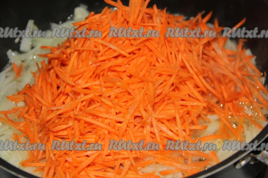 Очистить морковь и натереть на тёрке для моркови по-корейски или на крупной тёрке. Выложить морковку в сковороду и обжарить с луком в течение 10 минут, помешивая, а затем снять с огня.