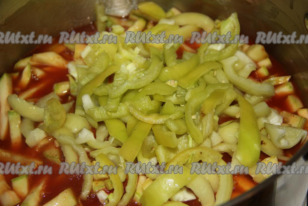 Болгарский перец вымыть и, удалив семена и плодоножки, нарезать на полоски. Добавить перец в кастрюлю к кабачкам.