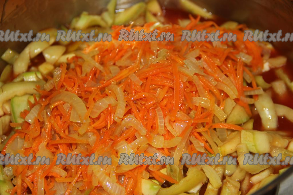 Затем добавить обжаренные лук с морковью, хорошо перемешать и довести салат до кипения.