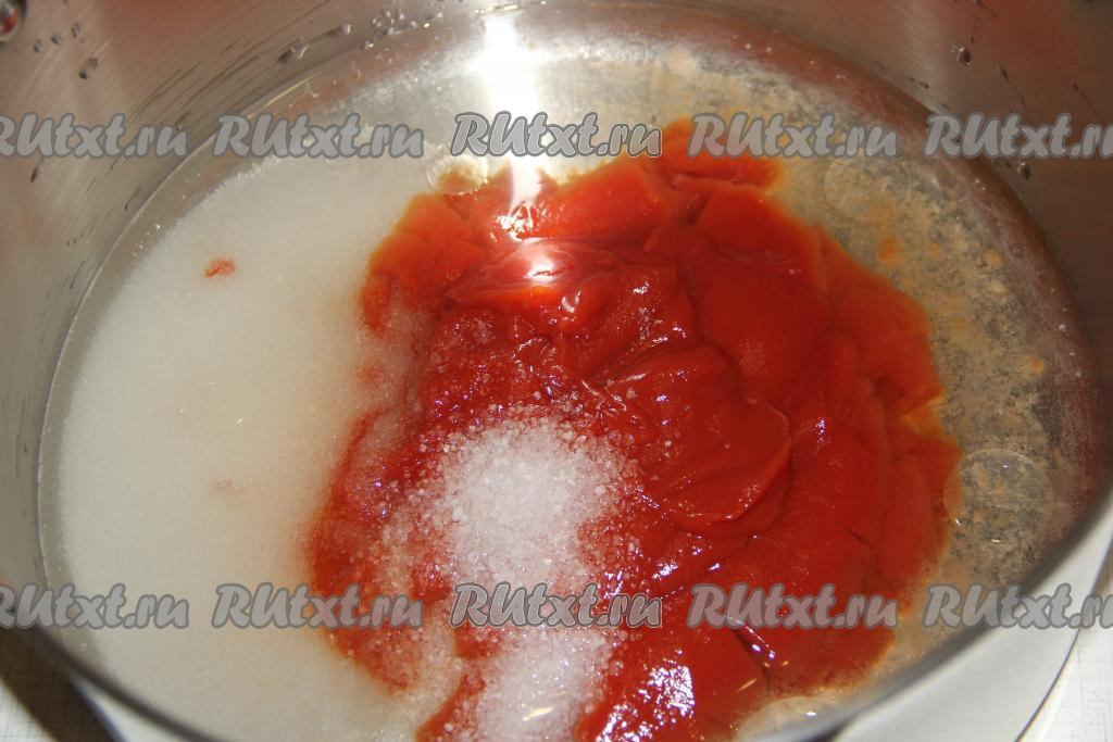 В большую кастрюлю влить воду, добавить сахар, соль и томатную пасту, хорошо перемешать и поставить на огонь.