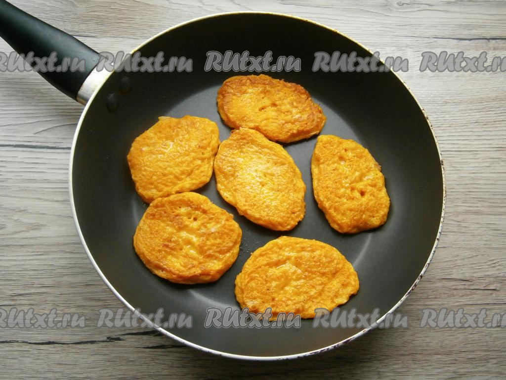 На разогретую с растительным маслом сковороду выкладывать тыквенную массу ложкой в виде небольших оладий. Жарить оладьи на среднем огне до легкого зарумянивания с двух сторон.