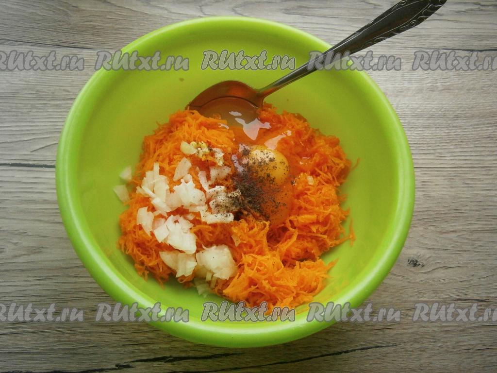 Сырое яйцо и мелко нарезанный очищенный репчатый лук добавить к натёртой тыкве, посолить и поперчить.