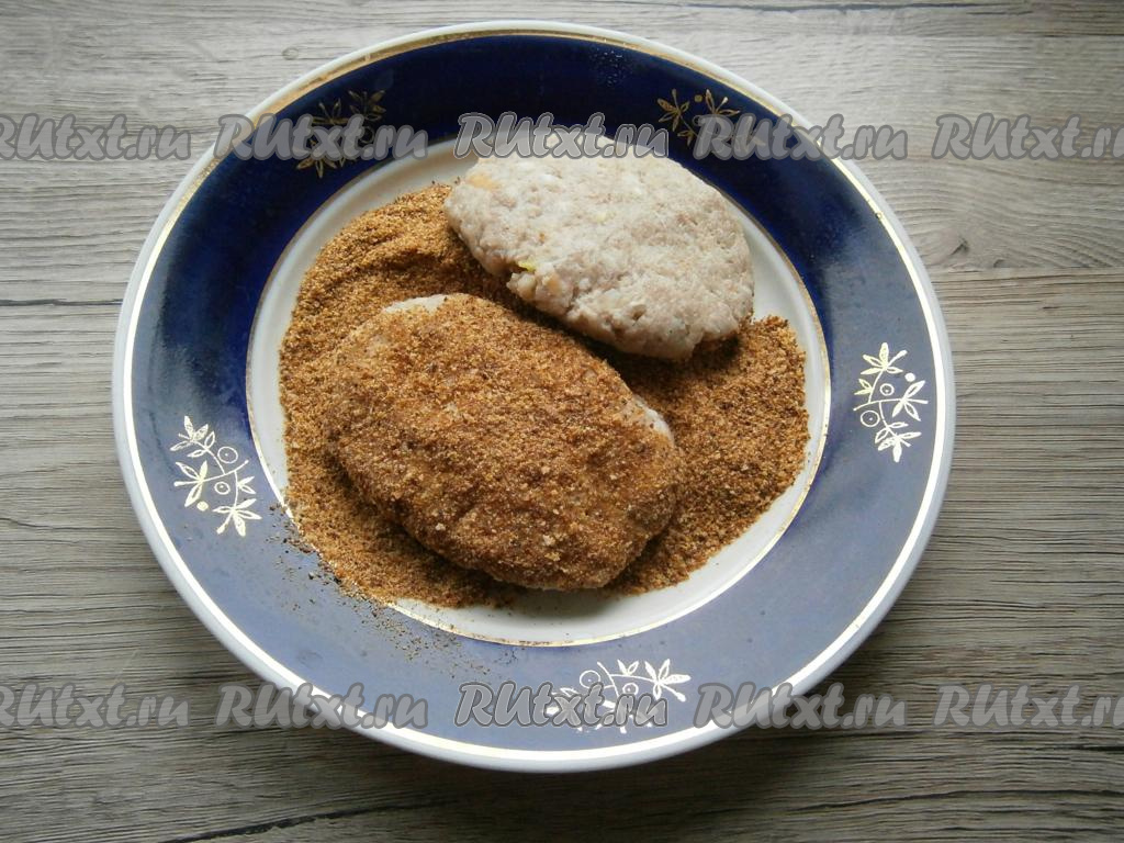 Влажными руками сформировать котлеты и обвалять их в сухарях.