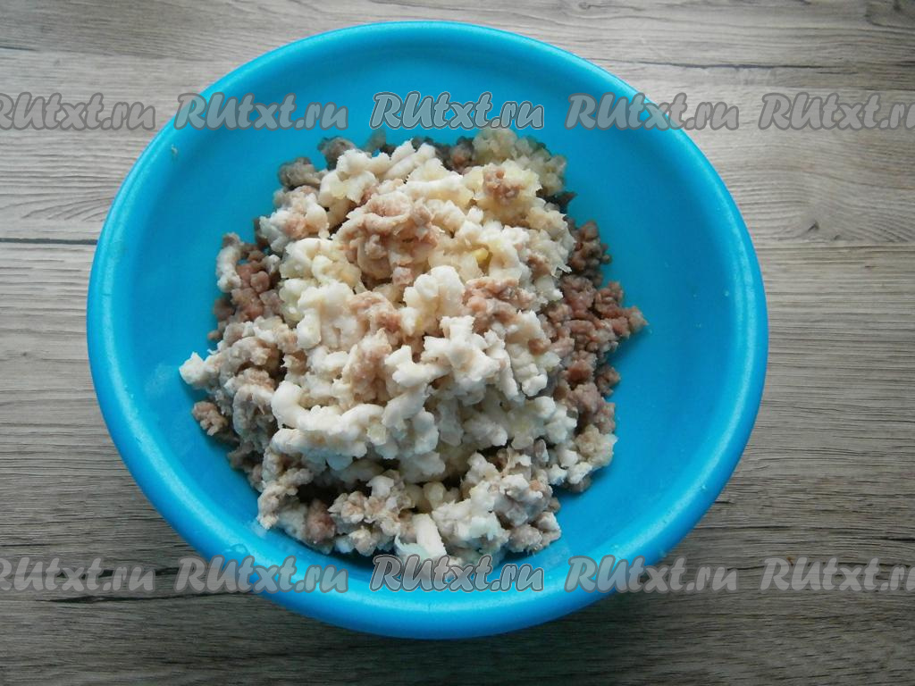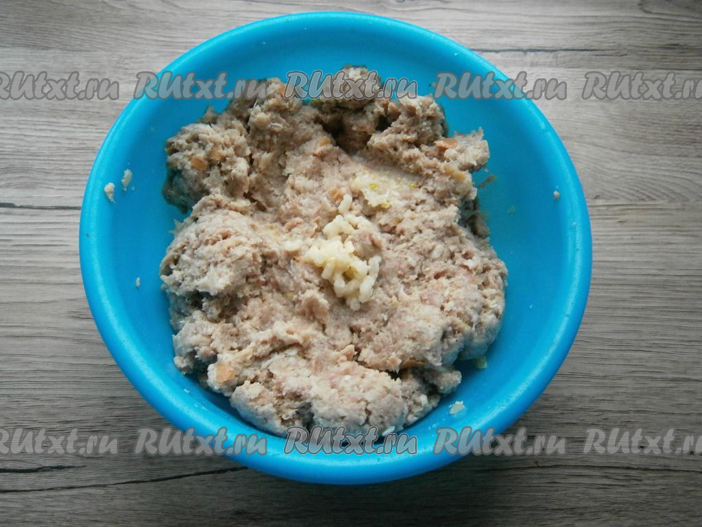 Фарш посолить и щедро поперчить, хорошо его вымешать и отбить. Добавить пропущенный через пресс чеснок, еще раз перемешать.