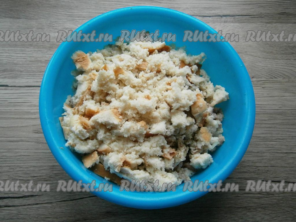 К перекрученному мясу и луку добавить батон, предварительно вымоченный в воде или молоке и отжатый от жидкости.
