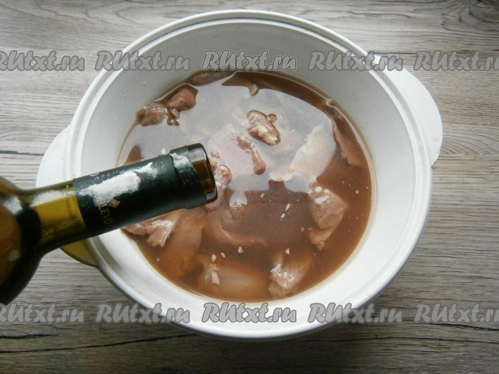 Кусочки мяса залить сухим вином и оставить для вымачивания в прохладном месте на 10-12 часов.